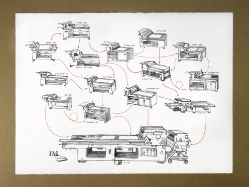 The gorgeous line drawing is by artist and designer Zoe Sadokierski, who has created a FAG press family tree (with our trusty “FAG OP-104” front and centre, of course!)