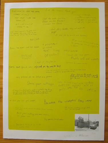 A limited edition poster was printed on the famous Sydney BIG FAG proof press in collaboration with the Big Fag Collective. The poster is a compilation of many of the fantastic gardening tips collected during the meetings with gardeners.
