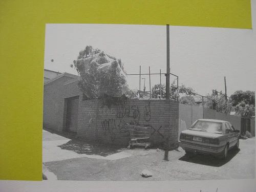 Printed on a very large scale, the poster also shows an image of an urban block from the rear. A fig tree bursts through a fence and behind the tree in a back lane sits an empty and abandoned shopping trolley and old tank like car.